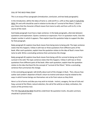 Or would we have given up? It is also important to try to see how things could have ended for Buck had he given up. However, this story speaks about more than just the sufferings of a dog. In the real-world, we try to avoid suffering as much as possible, what London is trying to convey is that suffering Is an inevitable part of life that, instead of trying to avoid, we should embrace and learn from it and that the sufferings in life builds our character to make us stronger, allowing us to reach our fullest potential as human beings to be the people we were created to be. This essay was written by a fellow student. You can use it as an example when writing your own essay or use it as the call of the wild essay source, but you need cite it.